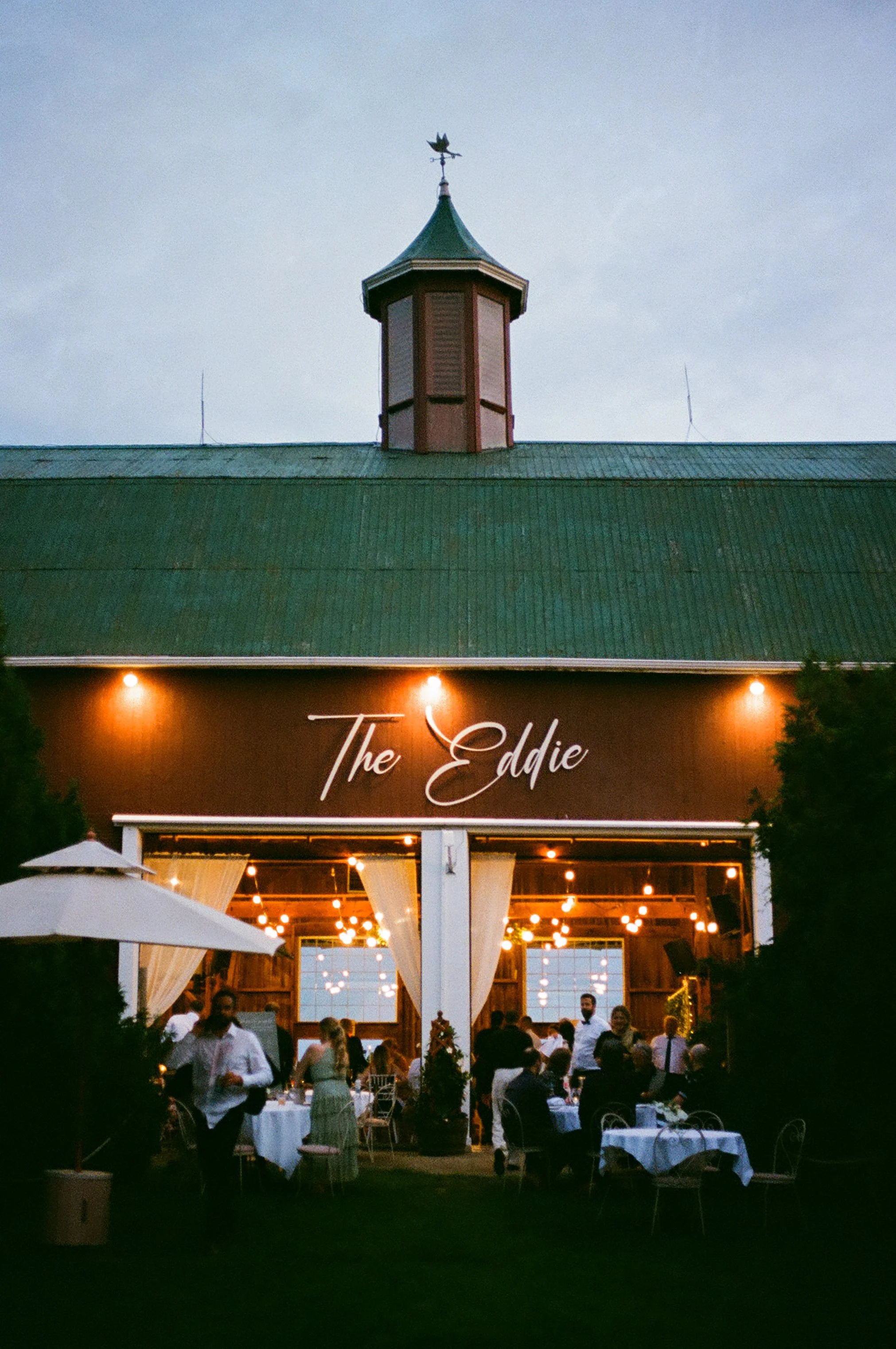 Group of four people smiling at an outdoor event in front of a barn with a sign that says 'The Eddie.' Two women and two men, dressed in semi-formal attire, holding glasses of rosé wine.
